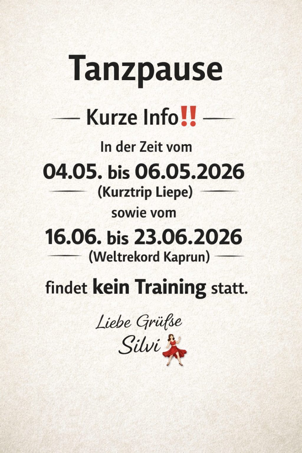 02.04.2026, 15:35 Uhr Hallo liebe Linedancer, unsere Trainer Silvi und Silke müssen heute leider aus verschiedenen Gründen das Training absagen. Der Verein wünscht euch ein paar schöne Osterfeiertage. Ganz liebe Grüße |