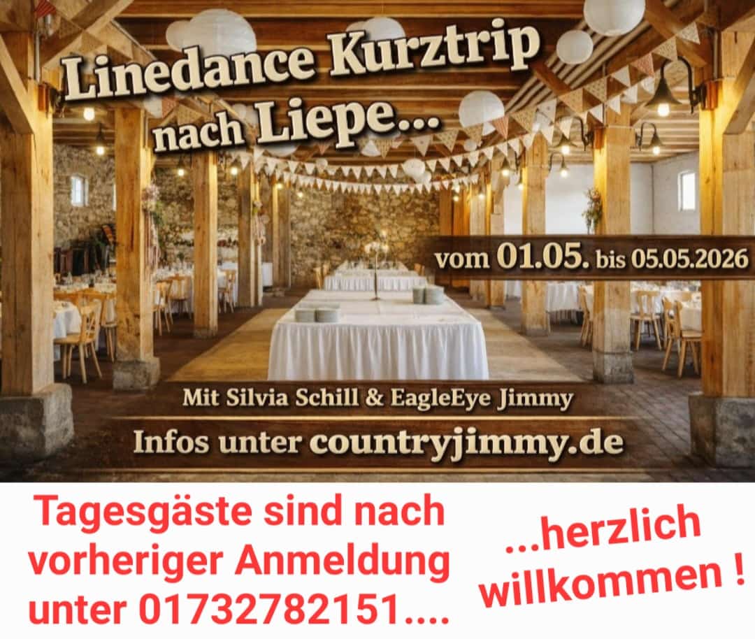 01.05. - 05.05.2026 Fahrt zum Landhof Liepe ![]() Fotogalerie Internationaler Flashmob am 02.05.26 wir machen mit....getanzt werden Hoedown, Heel Toe Rodeo und Everybody Dance Wo? Landhof Liepe – Der Erlebnishof Gutshof 1 16248 Liepe Wann? 14 Uhr Anschließend gemeinsames Tanzen mit EagleEye Jimmy und Silvia Schill und Friends. Wir freuen uns auf euch https://countryjimmy.de/events/linedance-in-liepe/ |